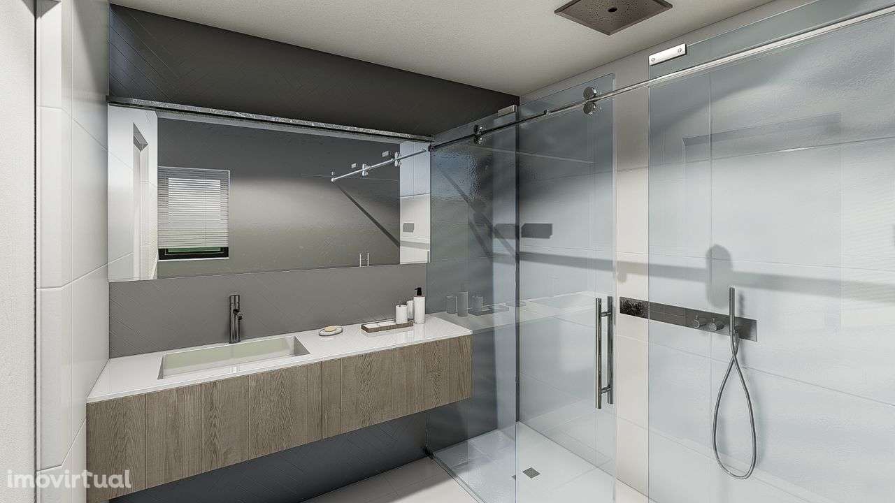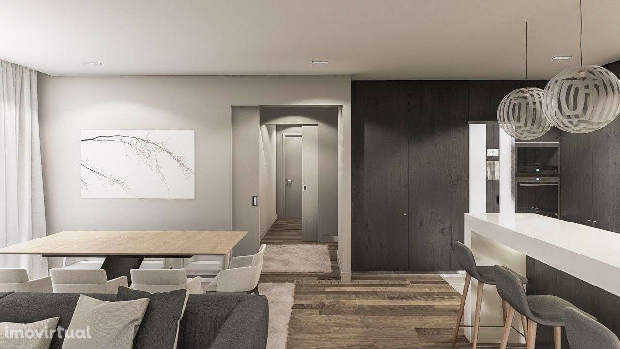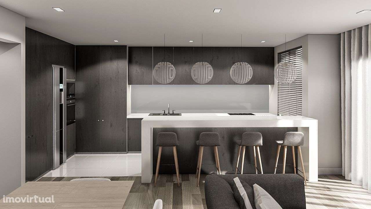 Acabamentos de luxo, ar condicionado, open space, chão em madeira, tetos falsos e cozinha com armários termolacados e equipada com máquina de lavar louça, frigorífico, forno, placa, exaustor e microondas.