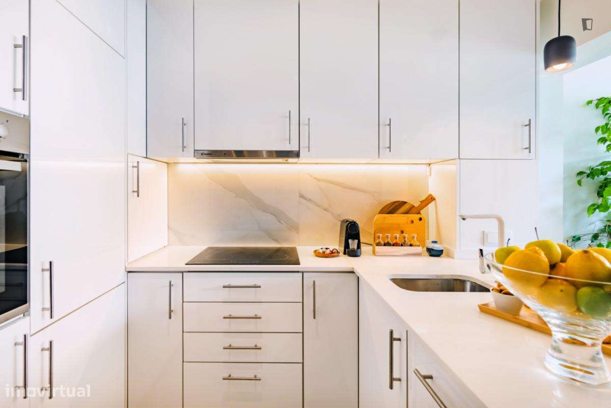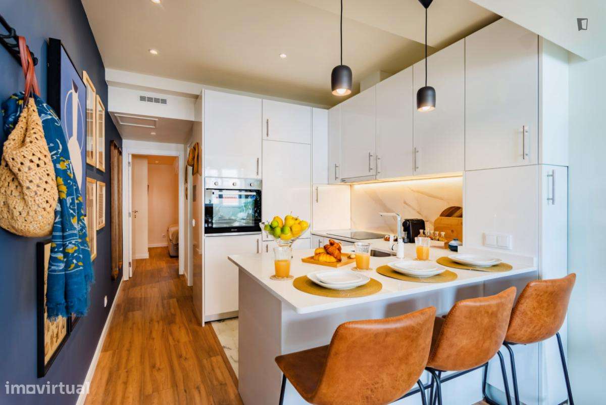 Apartamento luminoso com cozinha completa, que se destaca pelo seu amplo terraço soalheiro e pela localização privilegiada.